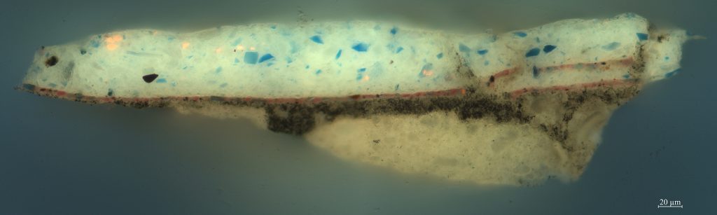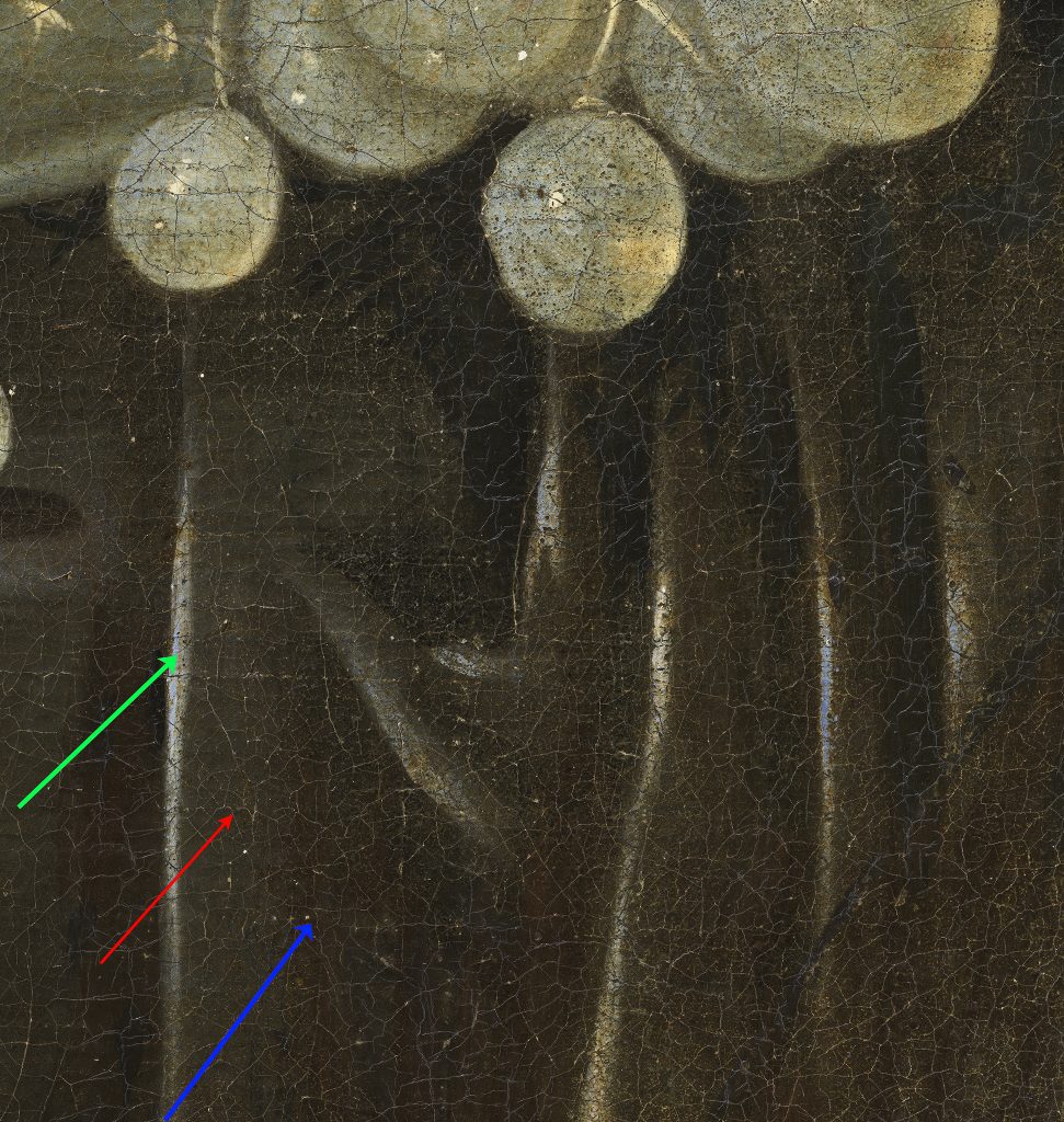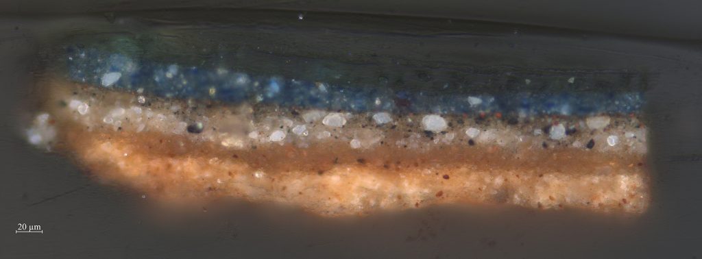 One such example is Johannes Rosenhagen’s (1640–1668) Fruit Still Life (fig. 13). Rosenhagen is a relatively unknown artist who was active in The Hague from about 1658 to 1668. The canvas is covered with a double ground, of which the lower layer is a light gray mixture of lead white and a small amount of fine black pigment (figs. 14 and 15). The upper ground layer is dark gray in color and is applied more thinly. It consists of a fine black pigment with some finer particles of lead white and a small quantity of fine yellow earth. This upper ground layer is applied streakily, with diagonal crisscross brushstrokes that are clearly visible in the MA-XRF scan for the element iron (FeK), related to a yellow earth pigment (fig. 16). The still life was painted on top of this dark gray layer and left uncovered in the background. This became clear when small losses and abraded areas were examined under the microscope. In the background, only the lower light gray ground layer is visible in paint losses, whereas in the rest of the still life, the dark upper ground/ background is also visible in losses, indicating it is present beneath the entire surface of the painting. In the grapes, the dark upper ground was also left uncovered and serves as the darkest tone in the modeling (fig. 17). Similarly, the upper ground plays a significant role in the modeling of the blue tablecloth. There, the light blue highlights were painted using lead white and ultramarine, whereas the midtones were painted with a copper-containing blue pigment mixed with some red pigments. The shadows were created by applying a transparent glaze of red lake and ultramarine on top of the dark gray ground layer (fig. 18).
