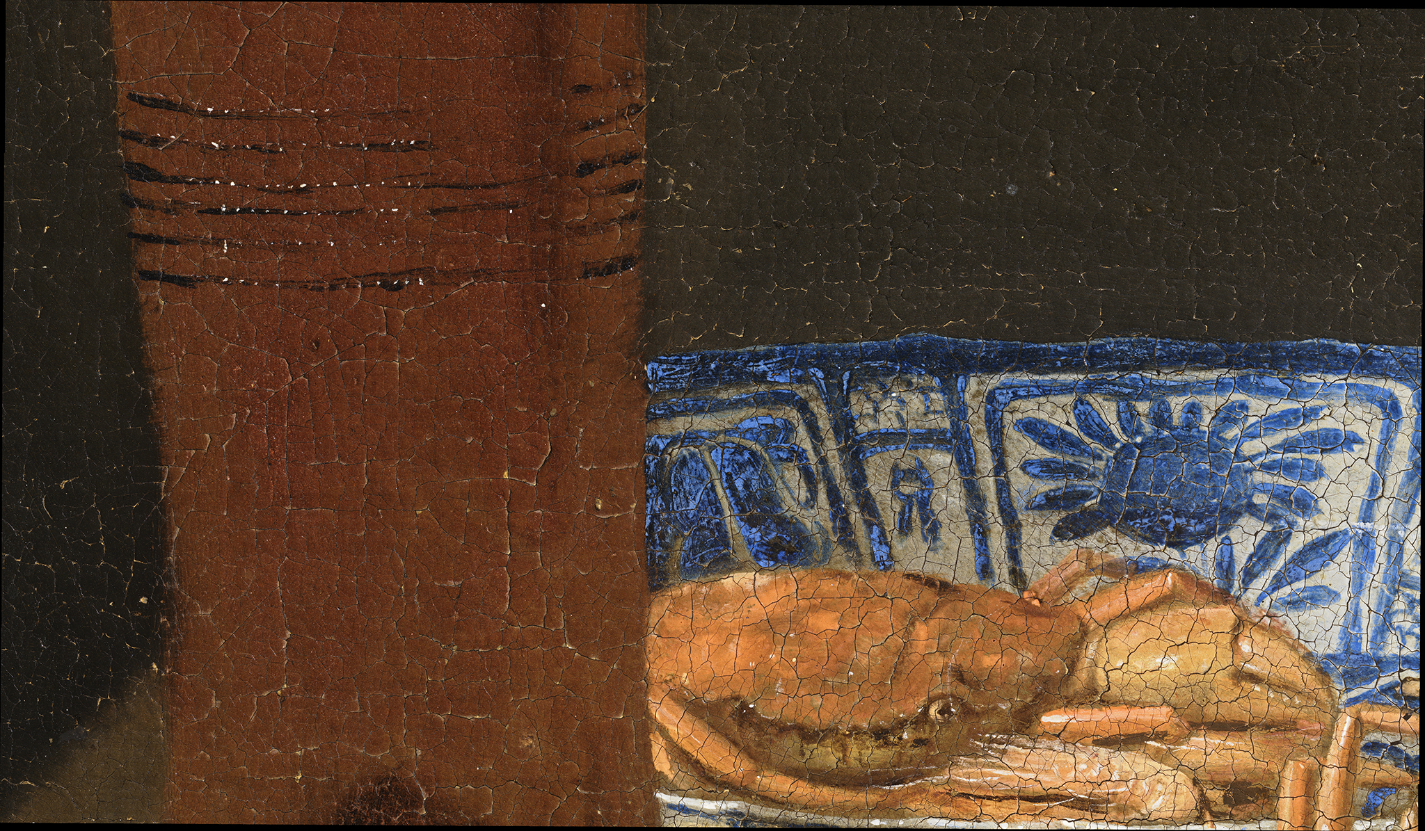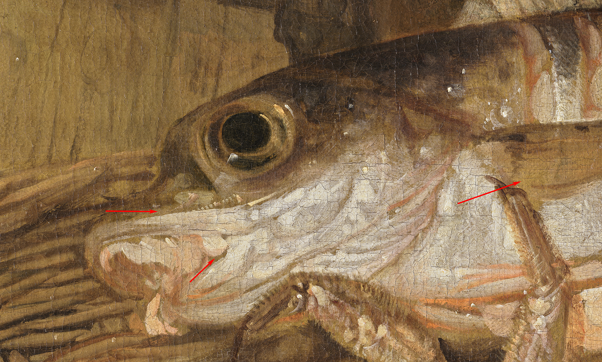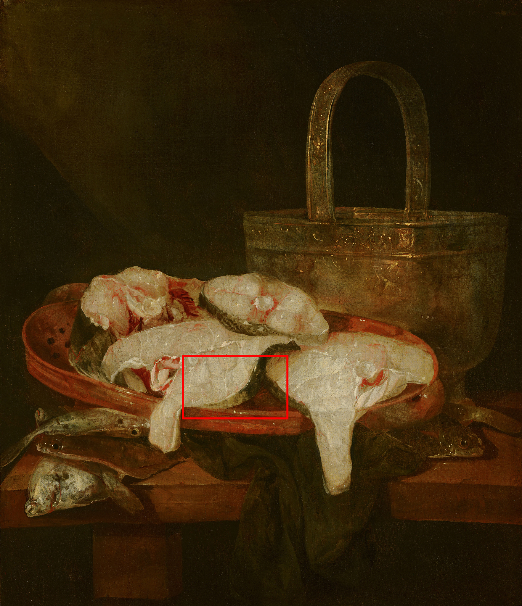 When filtering the data based on the subject matter of the still life, no clear trends appear. There seems to be no link between the color of the ground layer and the type of still life. There are, however, paintings by the same artist, with similar subject matter, on different ground colors. This is the case for Abraham van Beyeren’s fish still lifes in the Mauritshuis collection. Still Life with Seafood (fig. 6) is painted on a brown ground layer, while Fish Still Life is painted on a gray ground layer (fig. 8). In both cases, the ground layer is left “open” (visible) to contribute to the modeling of the pieces of fish. In Still Life with Seafood, Van Beyeren started by applying a dark undermodeling, serving as the darkest upper parts of the fish, leaving the ground layer uncovered to serve as midtones (fig. 7). The light belly of the fish is painted with soft yellow tones created with a mixture of lead white and lead-tin yellow. Red brushstrokes are applied for blood, and glazes are added for more depth. Short, hatched brushstrokes delineate the scales of the fish, applied crisscross or in one direction. In the white slices of fish, modeling is achieved by varying the thickness of the white layer, thus allowing the ground layer to shine through in varying degrees. Similarly, in Fish Still Life, the exposed ground creates the grayish tones in the pieces of fish (fig. 9). The lightest areas are achieved with thin layers of lead white mixed with a black pigment, and the blood at the center of each slice of fish is painted with vermilion (mixed with lead white) and a red lake glaze.