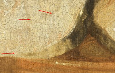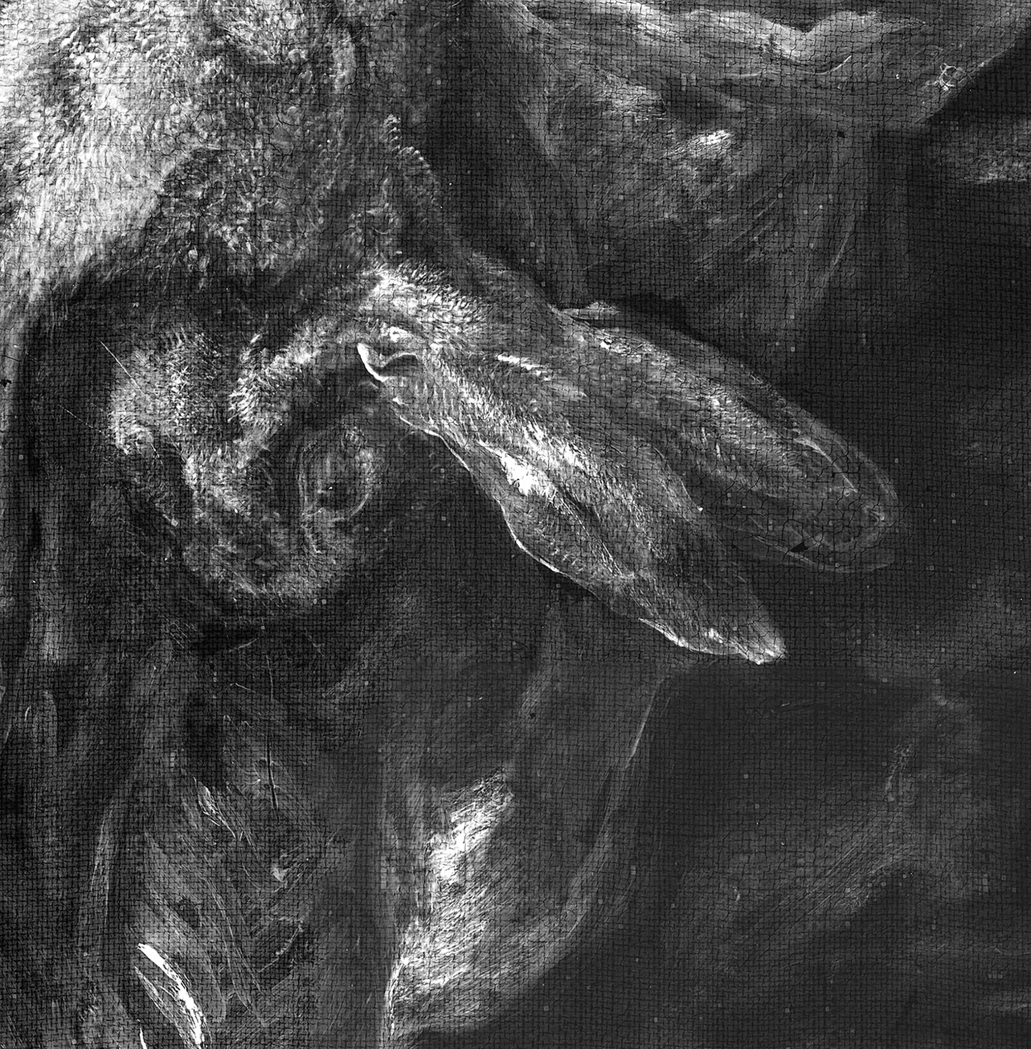 Still Life with Game is the only painting by Johannes Fijt in the Mauritshuis collection (fig. 43). The painting is tentatively dated 1640–1650, which would mean it was painted in Antwerp, after Fijt returned from Italy.26 It is on a canvas primed with a single brownish ground layer containing chalk and red earth pigments (figs. 44 and 45). This type of ground does not match those of other contemporaneous paintings from Antwerp found in the Mauritshuis, such as those by De Heem and Snijders mentioned above. Based on results from this study, a lighter ground layer appears to have been more common for paintings on canvas in Antwerp. Both De Heem and Snijders used a double ground with lower layers of mostly chalk and an upper layer of light gray containing lead white and black. The brownish ground layer found in Still Life with Game seems to correspond more with those made in Italy: specifically Rome, where a brownish ground layer, sometimes containing clay, seems to have been common. As reported in a study headed by Loa Ludvigsen, the Roman painter Girolamo Troppa (1630–1710) used a double ground mainly of brown27 Similarly, Maite Jover de Celis and Maria Dolores Gayo report the use of clay grounds by Diego Velázquez (1599–1660) when he was working in Rome.28 Apart from the ground, several other technical aspects of this painting point in the direction of an Italian provenance. Green earth, the common name for the iron potassium aluminosilicate minerals glauconite and celadonite, was found in several green and blue areas. It consists of large particles that are bluish green in color and contain silicium, aluminum, magnesium, and potassium. Although green earth was used as a pigment by some Dutch masters, such as Jan Steen and Johannes Vermeer (1632–1675), it was not a common pigment in the Netherlands; it was used more abundantly in Italy.29 Another indication of this painting’s Italian provenance is the type of canvas used as a support. With an average thread count of only 7 x 6 threads per centimeter, it has a very open weave (fig. 46). The average thread density of the other still lifes analyzed in this study is about 13 x 13 threads per centimeter, with extremes of 10 and 19 threads per centimeter. This makes the open canvas of Fijt’s Still Life with Dead Game a distinct outlier. Within the Mauritshuis collection, similarly open-weave canvases have been found only in Italian paintings, where it was more common to have very coarse canvases.30 The Italian origin of this painting has implications for the date. Rather than tentatively dating it 1640–1650, the painting can be dated to Fijt’s Roman period, between 1635 and 1641.