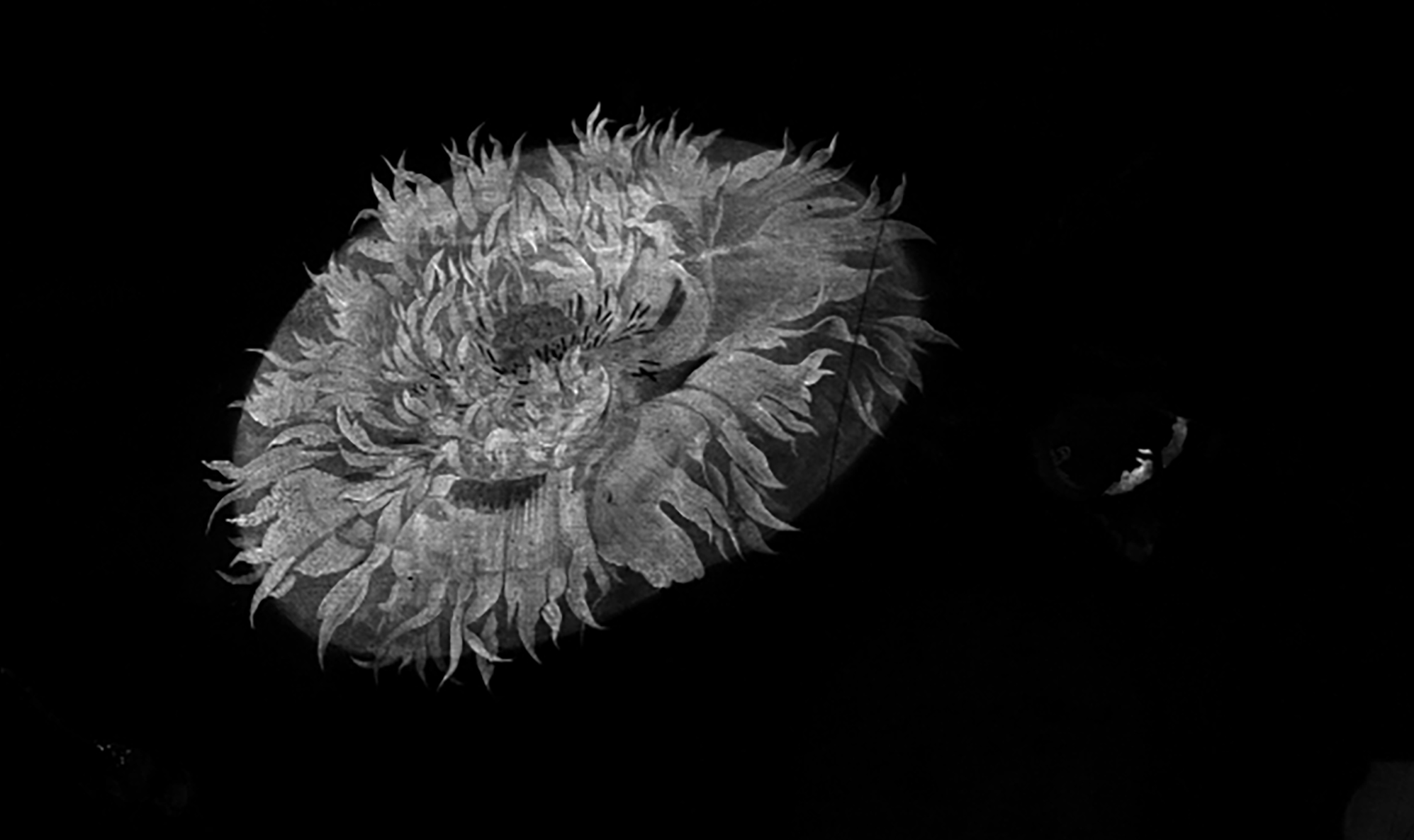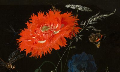 The Teycken bouck voor de jonge jeught (part of the 1701 Wiltschut manuscript, Frits Lugt Collection, Fondation Custodia, Paris) is an illustrated treatise specifically devoted to still life painting.8 Although no recipes for ground layers are included, there is an important mention about the use of local underpaints on top of ground layers for flowers in still lifes.9 In flower still lifes—by, among others, Seghers, Jan Davidsz. de Heem, and Abraham Mignon (1640-1679) as in figure 10—these local underpaints have been detected in earlier studies using scientific technologies. On top of an even-colored ground, circles or ovals were painted in colors and shapes related to the final flowers. This was a way of blocking out the composition, but it also provided a suitable base color to work up further.10 These local underpaints are sometimes visible through the upper paint layers but can also be made visible with imaging techniques like infrared reflectography (IRR) or macro-X-ray fluorescence (MA-XRF) scanning. Within the Mauritshuis collection, this working method was found in still lifes by Seghers, Jan Davidsz. de Heem, Maria van Oosterwijck (1638–1693), and Mignon. In Mignon’s Flowers in a Metal Vase, for instance, the large poppy at the top of the bouquet contains a local undermodeling in vermilion, as can be seen in the MA-XRF map for mercury (Hg-L). When comparing this undermodeling with the upper paint layers, it becomes clear that the individual petals of the poppy were defined by partially painting the background over the undermodeling (figs. 11 and 12).