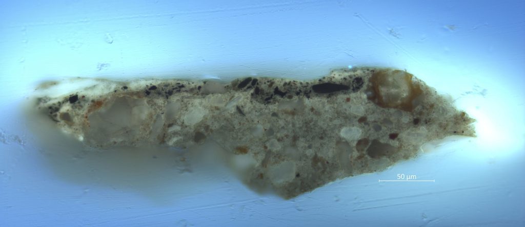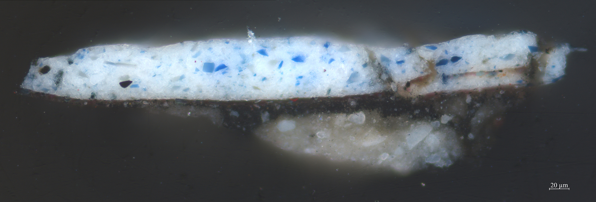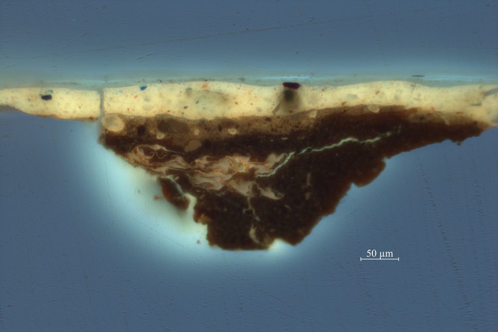 Rotterdam-born artist Willem Kalf (1619-1693) used a very dark gray upper ground in his Still Life with a Roemer of 1659 (fig. 22). The painting must have been made in his Amsterdam period, as Kalf moved to Amsterdam in 1653 and died there in 1693. The canvas support is prepared with three ground layers, of which the bottom one contains chalk and yellow and brown earth (figs. 23 and 24). It is followed by a thinner light gray layer of lead white, fine black, and brown earth. The uppermost layer is equally thin but very dark, and it contains bone black, brown earth, and some lead white. The lower two layers seem to be more common for ground layers, judging by other examples of double grounds on canvas found in this study. Therefore, it seems likely that Kalf used a pre-primed canvas onto which he applied the dark upper ground layer. In the background, that uppermost layer remains visible in many areas, as it is only partially covered with transparent glazes to model an alcove and wall. It shines through all the objects, giving the painting a dark appearance. A similar working method was reported by Wallert for Kalf’s Still Life with Silver Jug from the collection of the Rijksmuseum (tentatively dated 1656).13