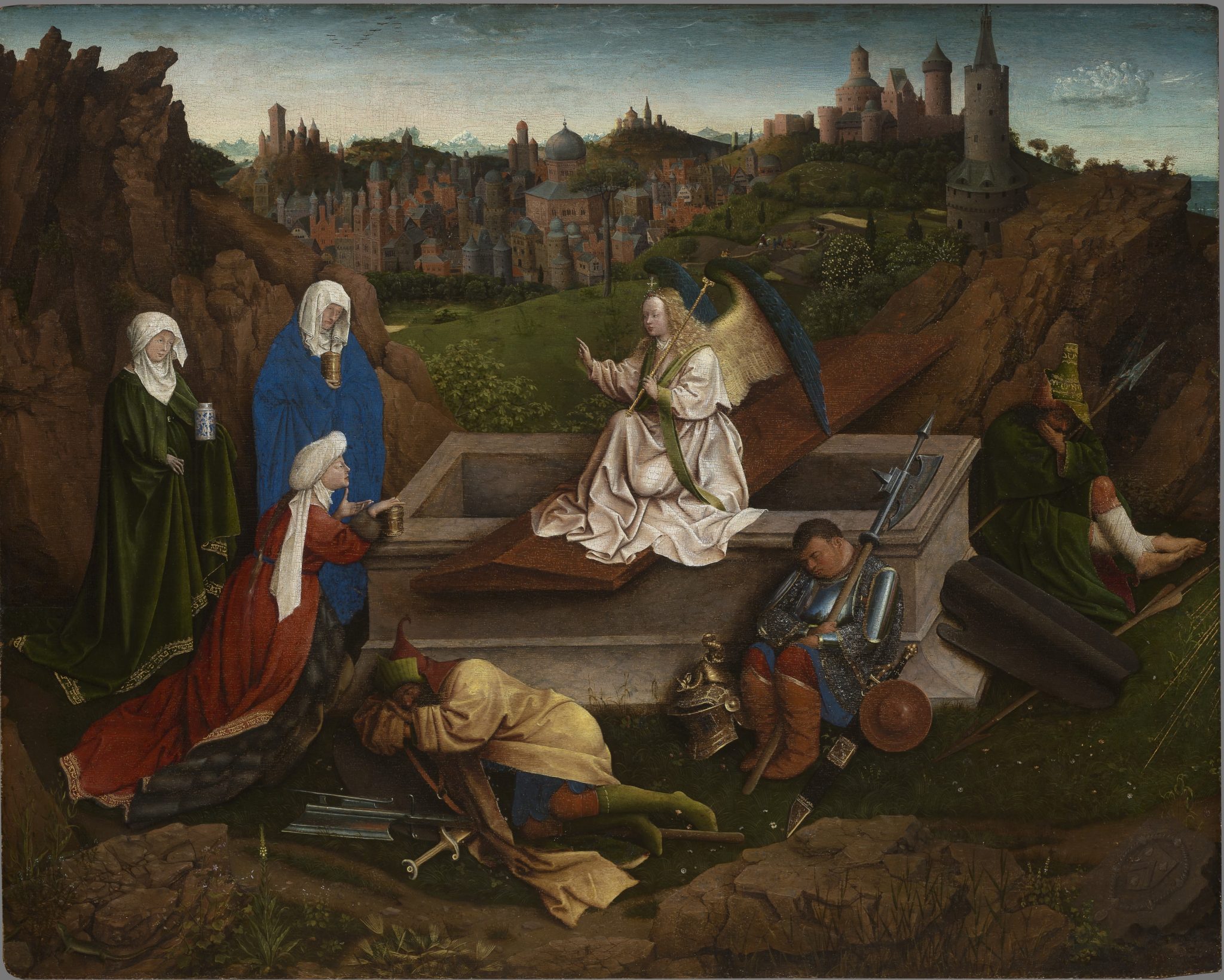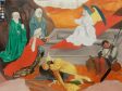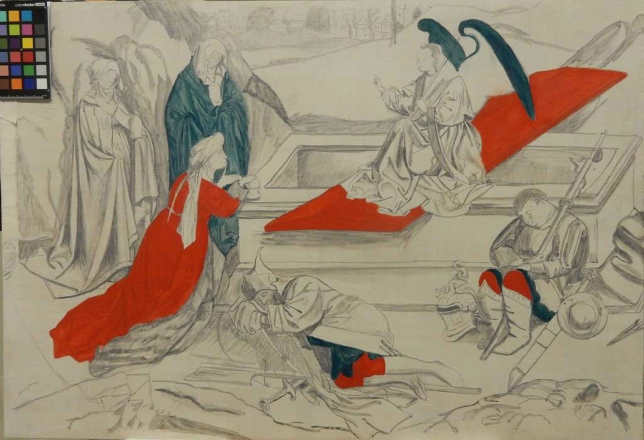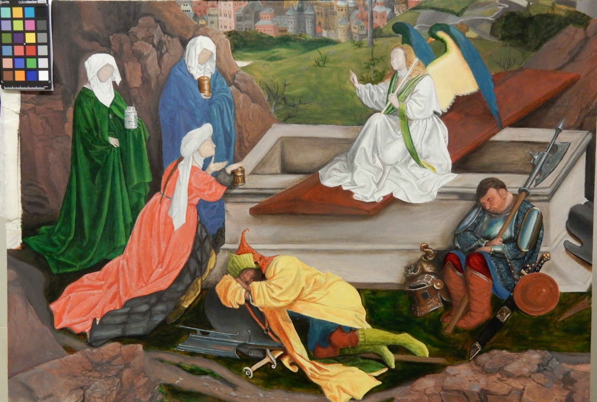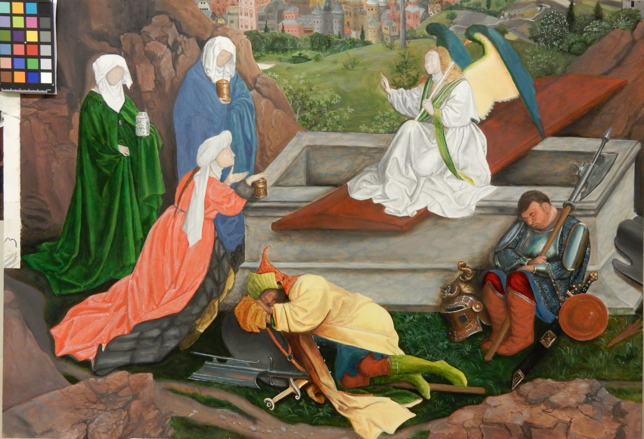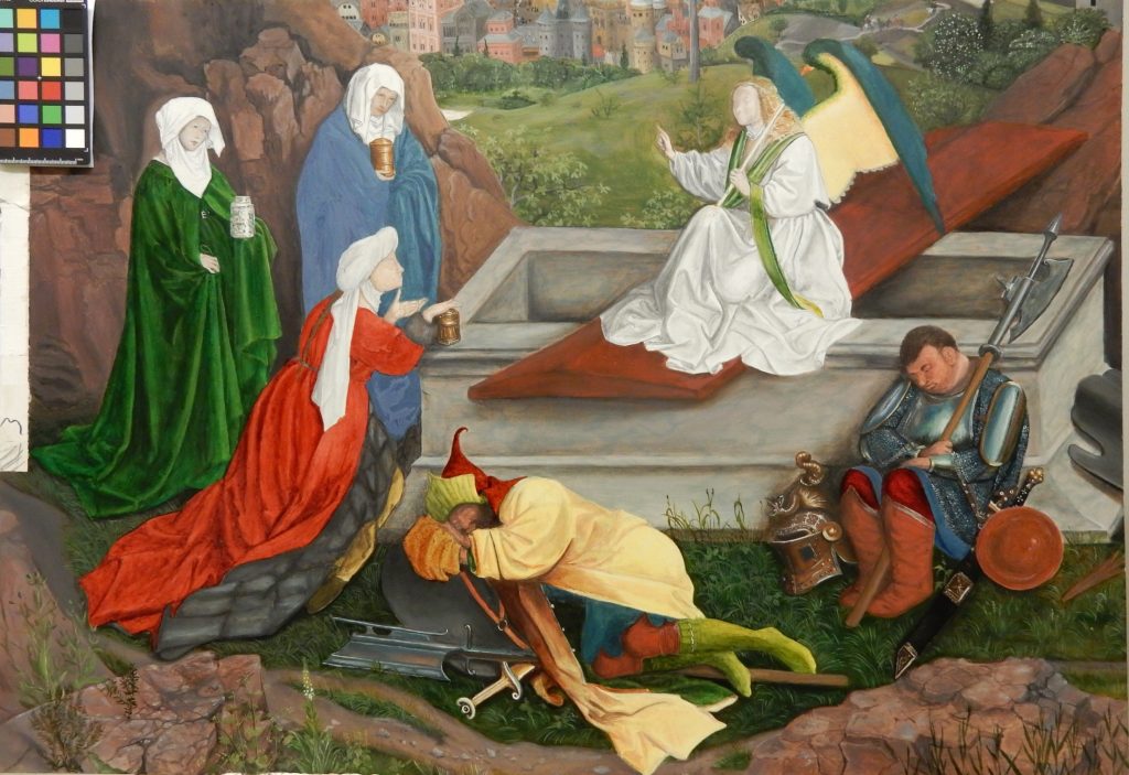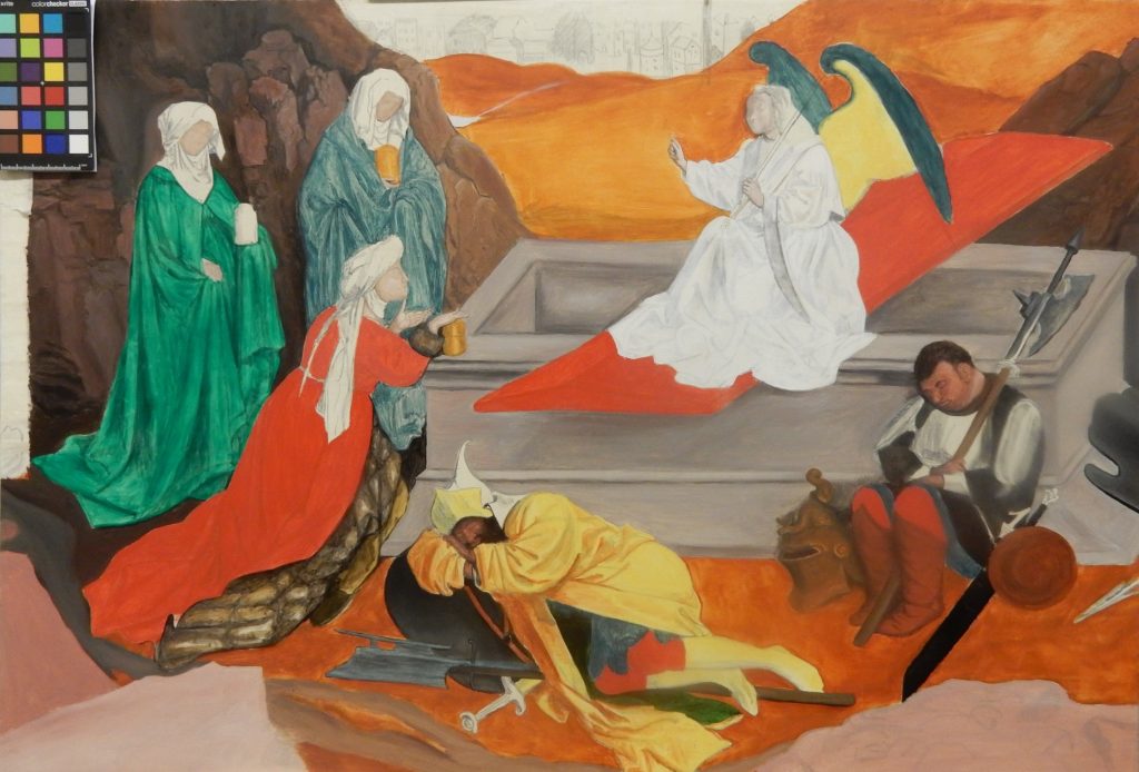 The way that reconstructions help investigate this phenomenon can be illustrated with a comparison between a painting executed on a white ground, using Eyckian methods, and the building up of a painting according to seventeenth-century practice. In her step-by-step reconstruction, Indra Kneepkens retraces the execution of Jan and/ or Hubert Van Eyck’s Three Marys at the Tomb. On the white ground (fig. 14), the underdrawing was applied (fig. 15), followed by an unpigmented isolation layer. The painting was then slowly built up in multiple layers, from opaque base tones to more transparent glazes in the final layers of the painting. To gain the required depth of tone, the glazes were applied in multiple layers, as a single thick layer would not dry without wrinkling, cracking, or even dripping down the paint surface. This reconstruction also shows that every section of the painting has its own distinct buildup: various shades of red below the red draperies, blues below the ultramarine glazes of Mary’s dress, and pale yellow and orange as base layers for the coat of the sleeping guard in front of the tomb (figs. 16, 17, 18, 19 ).