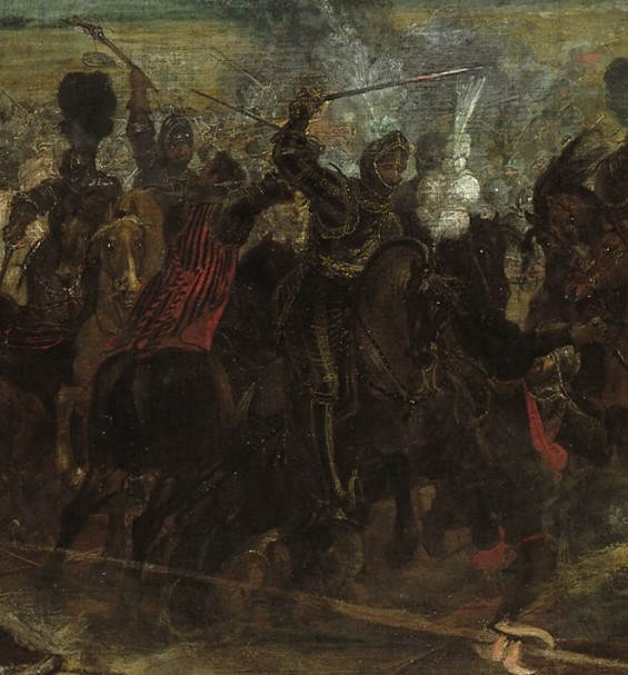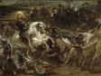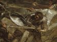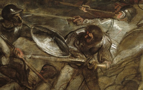 For the dead-color phase, artists used two strategies, both of which are recommended in contemporaneous sources. One was to set up the dead color on top of the colored ground in a rather liquid, monochrome paint, typically in a dark color, sometimes involving rough indications of the main color areas in the painting. This type of dead color is often referred to as an “oil sketch” in art historical literature. A gray or brownish colored ground could act as a midtone in this phase, as seen in an unfinished painting by Rubens, Henry IV at the Battle of Ivry (fig. 8), which offers an example of what a painting might look like at this stage. The painting shows how Rubens first indicated the main shapes with thin brown paint that he applied directly onto the gray ground—for instance, in the falling soldier on horseback in the foreground (fig. 9). The gray ground acts as a midtone and sits between the rough indications of highlights and shadows in the slightly more worked-up areas, where Rubens added some indication of color. The technique that is so clearly visible in this painting was also used by other artists in the Northern Netherlands, as discussed in the articles by Petria Noble, Anne Haack Christensen, and Marya Albrecht and Sabrina Meloni in this issue.28 The background, for which Rubens engaged his colleague Peter Snayers (1592–1667), is in a relatively advanced state of execution—in line with the advice voiced in contemporaneous sources to develop the composition from back to front—and here the gray ground is covered to a higher degree (fig. 10).29