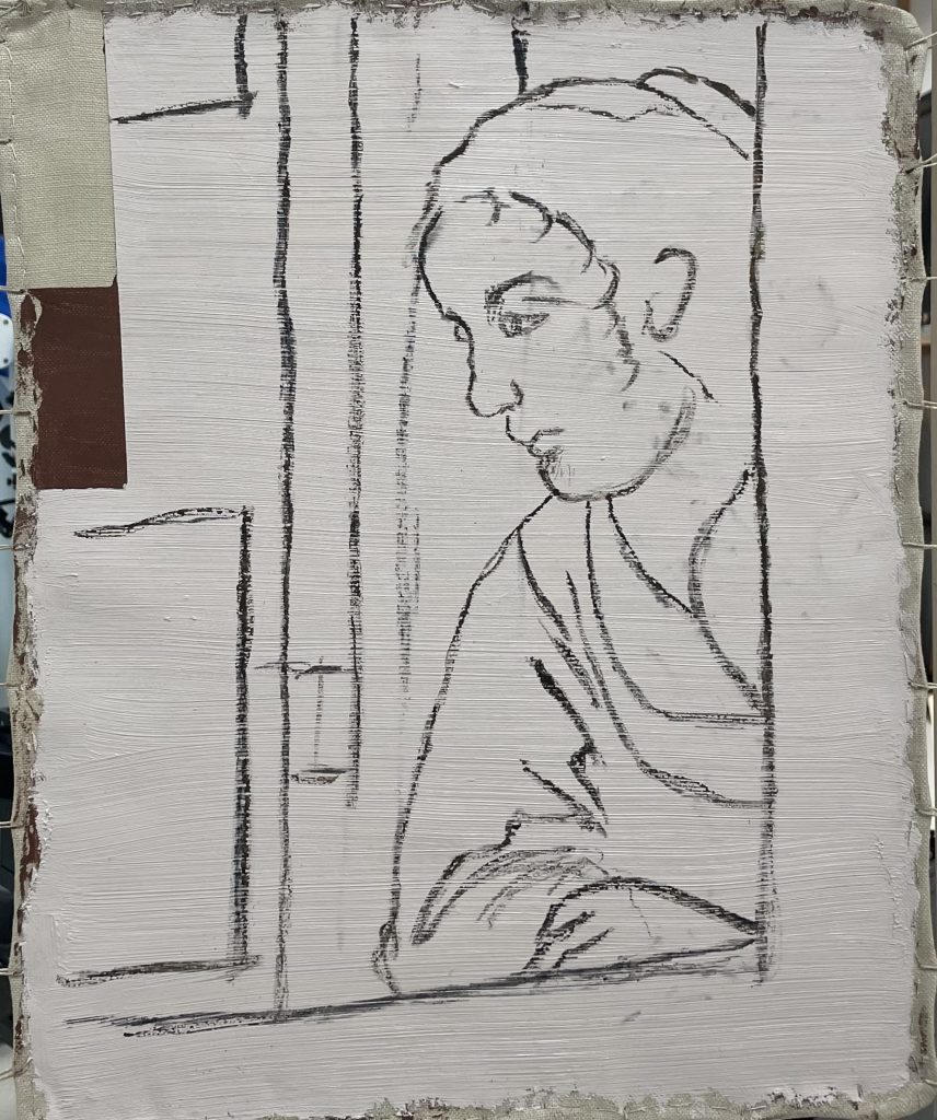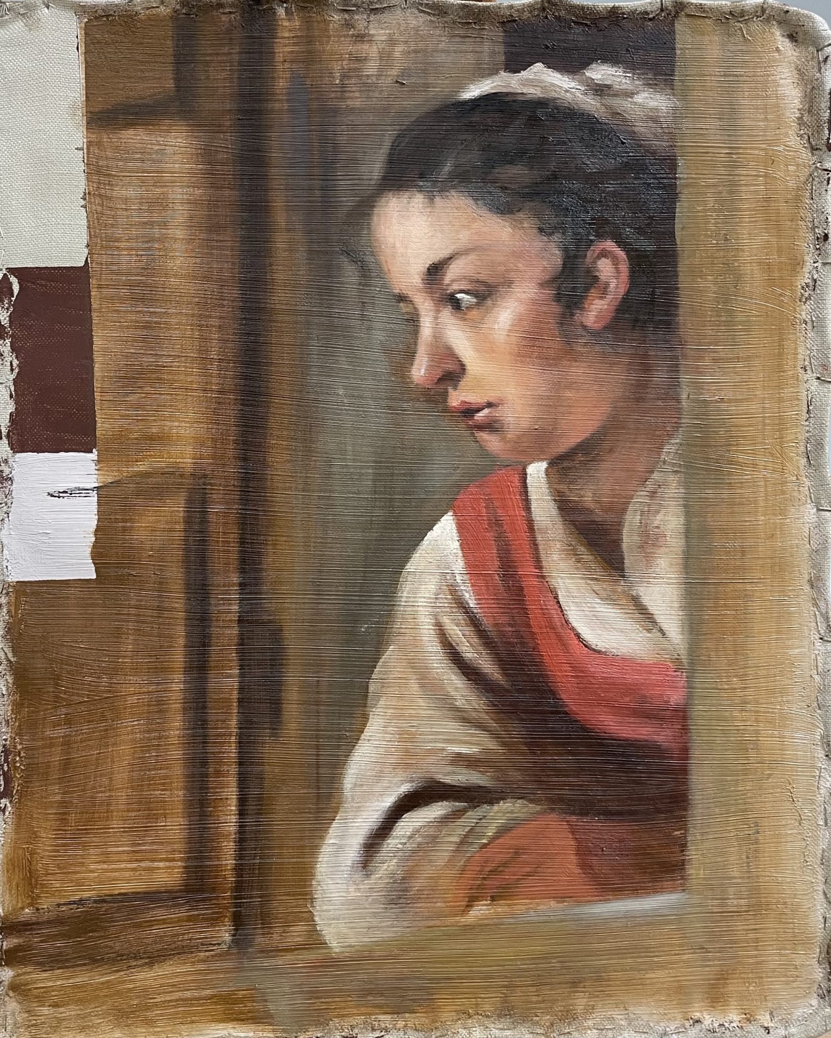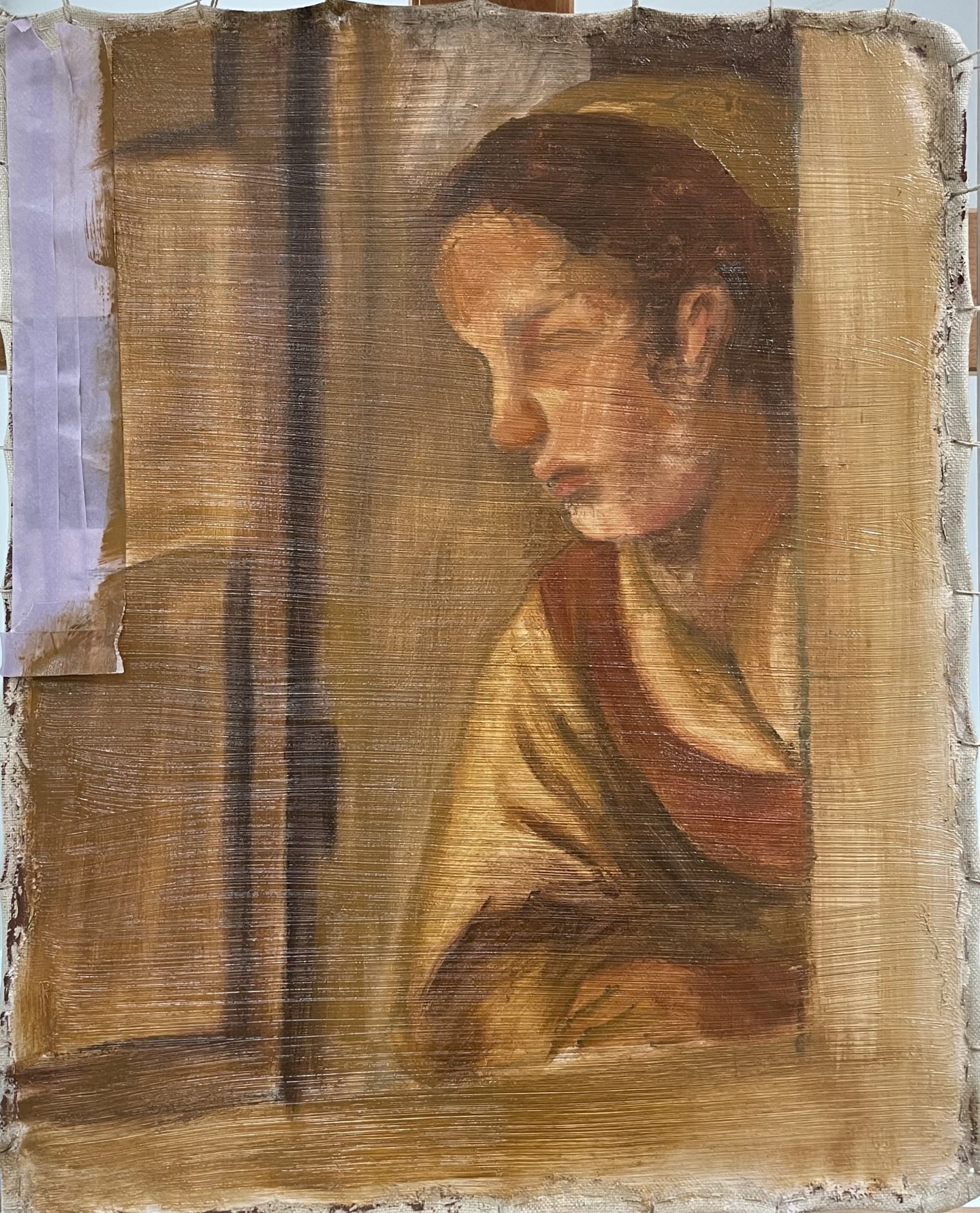 The Eyckian methods stand in strong contrast to the buildup of Ferdinand Bol’s large Elisha Refusing the Gifts of Naaman from 1661 (fig. 20). A reconstruction by University of Amsterdam Conservation and Restoration student Chloe Chang of a section from this painting (the girl leaning out of the window on the right-hand side of the large canvas) shows how a harmonious tonality can be created by making use of the gray ground and brownish dead color (figs. 21–24). Bol worked on a canvas covered with a ground consisting of two layers, a first red layer and a second gray one (fig. 21). After sketching out the most important elements in the composition with a painted underdrawing (fig. 22), Bol applied the dead coloring in a warm gray for the main contours and lights/ darks, reinforced with some roughly indicated color areas (white, some skin tones, and the midtone of the red bodice; (fig. 23). In the working up, he gave the painting its details, and most of the ground disappeared beneath opaque skin tones, dark hair, and the highlights and shadows in the girl’s dress. Not everything was covered, though; Bol allowed the ground to shine through in the architecture and in transitions between midtones and shadows (fig. 24). The difference between fifteenth-century and seventeenth-century methods is very clear when we compare how light areas are created. Bol made the white of the girl’s skin and clothing using thick applications of opaque lead white, while Van Eyck created the light skin tones with thin layers only partly covering the white ground. In the Bol reconstruction, the grayish brown of the ground and the dead color retain a visual function in the final painting, contributing to the harmony and balanced tonality that was considered so important in Dutch seventeenth-century art.