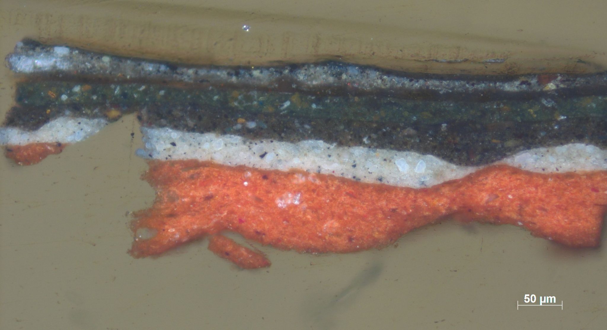 Paints were typically allowed to dry between all three phases, as wet-in-wet application would result in the smearing of lower layers, destroying the depth and purity of the tones. The layered-ness of these paintings means that the stages can be distinguished in paint cross sections, where they are visible as distinct lines of color that sit on top of each other (fig. 13). However, all three stages are not always present throughout a painting. In more openly or sketchily executed works, an artist could choose to leave visible areas belonging to the dead color phase or even the ground itself.