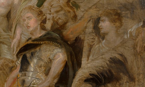 The more finished background in Rubens’s Henri IV (see fig. 10) gives insight into what a painting might look like in the second stage of working up (opwerken). In this phase, the figures, buildings, and main details are executed in color. Rubens used warmly colored glazes to create the deeper tones, a step called verdiepen (deepening) in contemporaneous sources. He also added lighter, opaque scumbles, an action described as verhoogen (raising) in those same sources, to complete the illusion of three-dimensionality. With the working up finished, a painting appeared complete, or nearly so.33