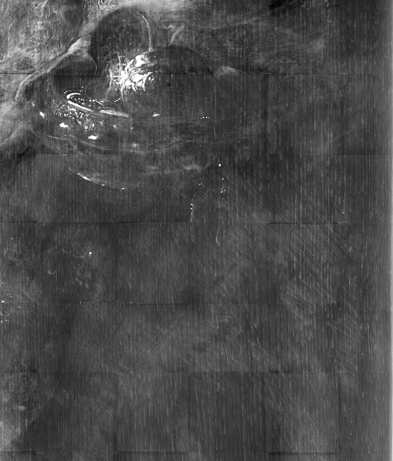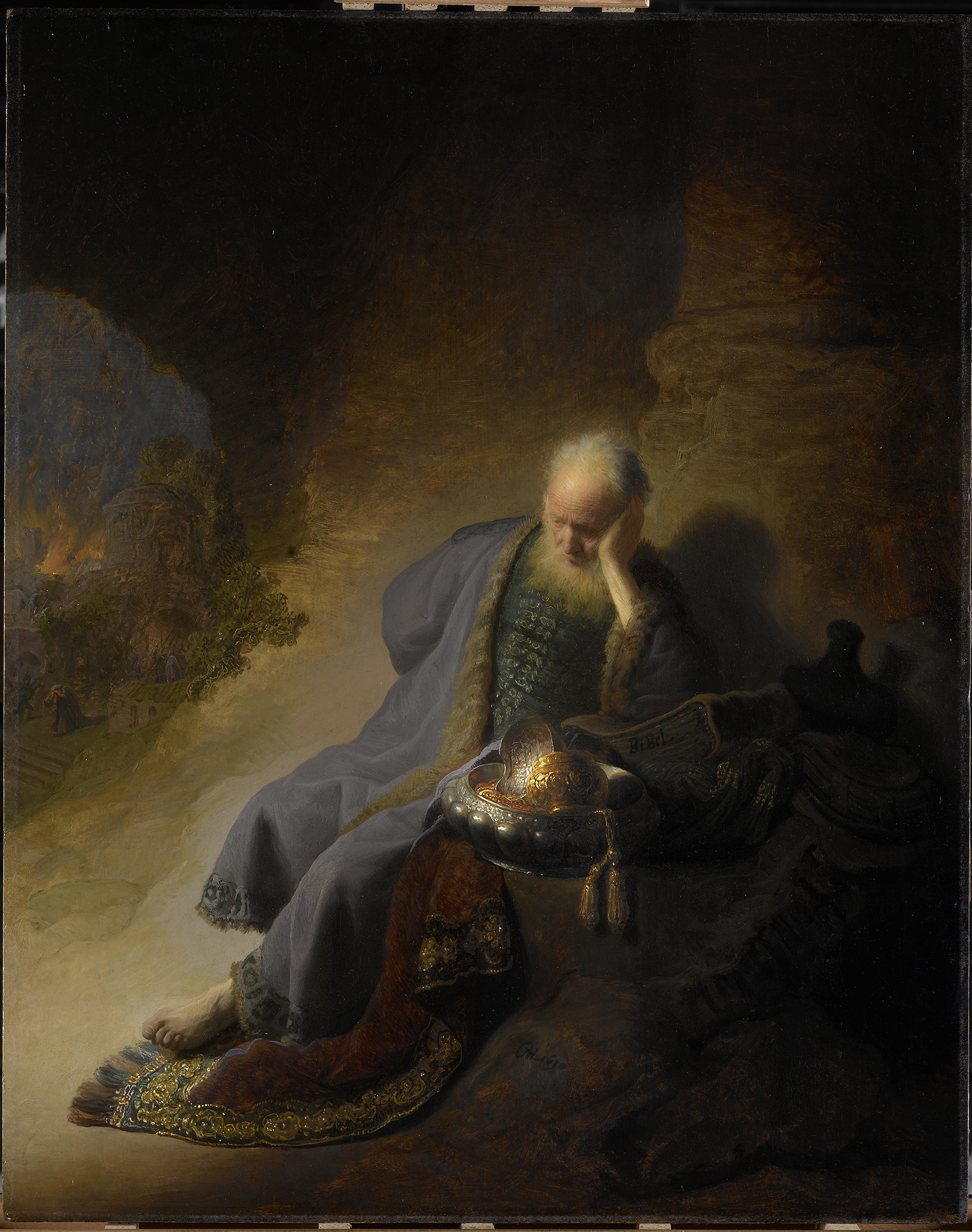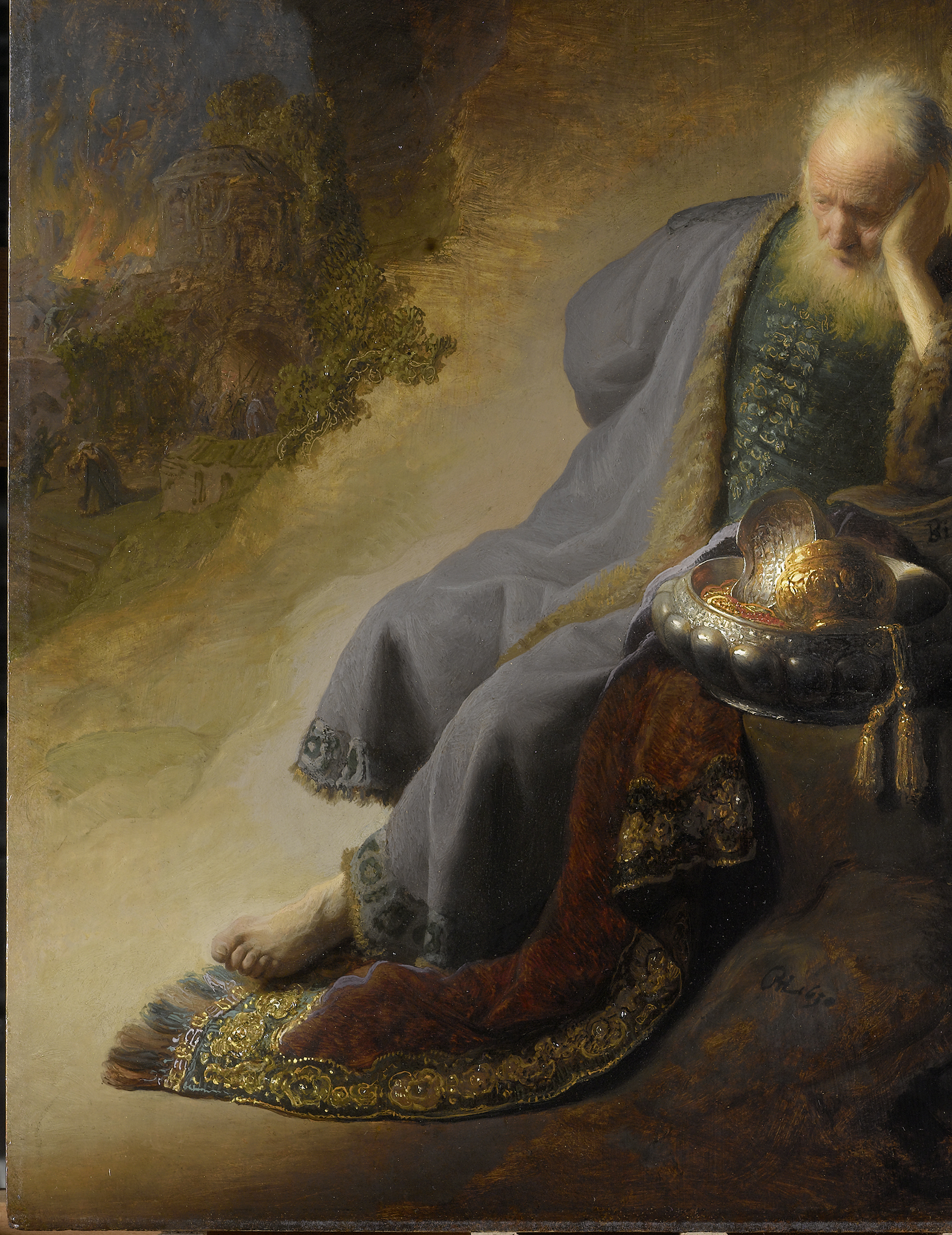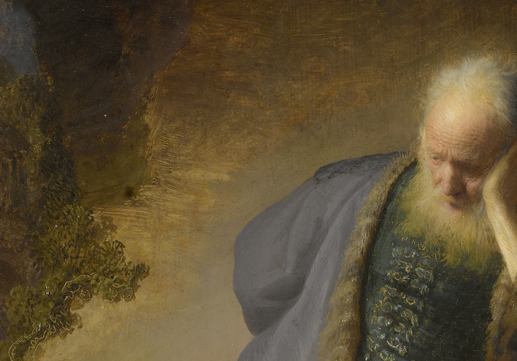 Rembrandt’s interest in creating a more convincing depiction of nature led him to exploit the possibilities of light-colored grounds to suggest light and space.32 His early masterpiece Jeremiah Lamenting the Destruction of Jerusalem from 1630, a groundbreaking painting due to its innovative technique and psychological intensity (fig. 12), represents a high point of this more tonal approach and shows how he achieved both houding and welstand by making use of the ground. The conventional ground comprises an upper ground layer of lead white and a little brown earth pigment, applied over the lower chalk ground.33 The lead white in the upper ground layer absorbs X-rays sufficiently to show the grain of the wood (fig. 13). The ground shimmers through the areas of open brushwork, providing luminosity to the scene. It is also left exposed in a few areas of broad scratching inscribed into the wet paint of the braiding on the doublet and in the foliage at the left. A large, diagonal section of ground to the left of the prophet shows through the thinly applied ocher-colored paint used to evoke the sandy desert landscape (figs. 14 and 15). Remarkably, the reflective properties of the exposed ground appear to emanate from within the painting itself, providing an indirect source of light that illuminates the figure of Jeremiah and intensifies the purplish hue of his cloak. This subtle interplay between the warm-toned ground and the cool purple of his garment creates a sophisticated color harmony. The ground’s luminous quality transforms what might otherwise be empty space into an active participant in the painting’s narrative—setting Jeremiah apart from his vision, depicted in the background on the left, while simultaneously fusing the two pictorial realms and opening the painting up to complex theological interpretations.34 Fine, diagonal scratches in the ground, possibly with a pumice stone, are visible in the thinly painted lower foreground, suggesting Rembrandt went to considerable effort to enhance the optical properties of the ground.35