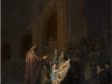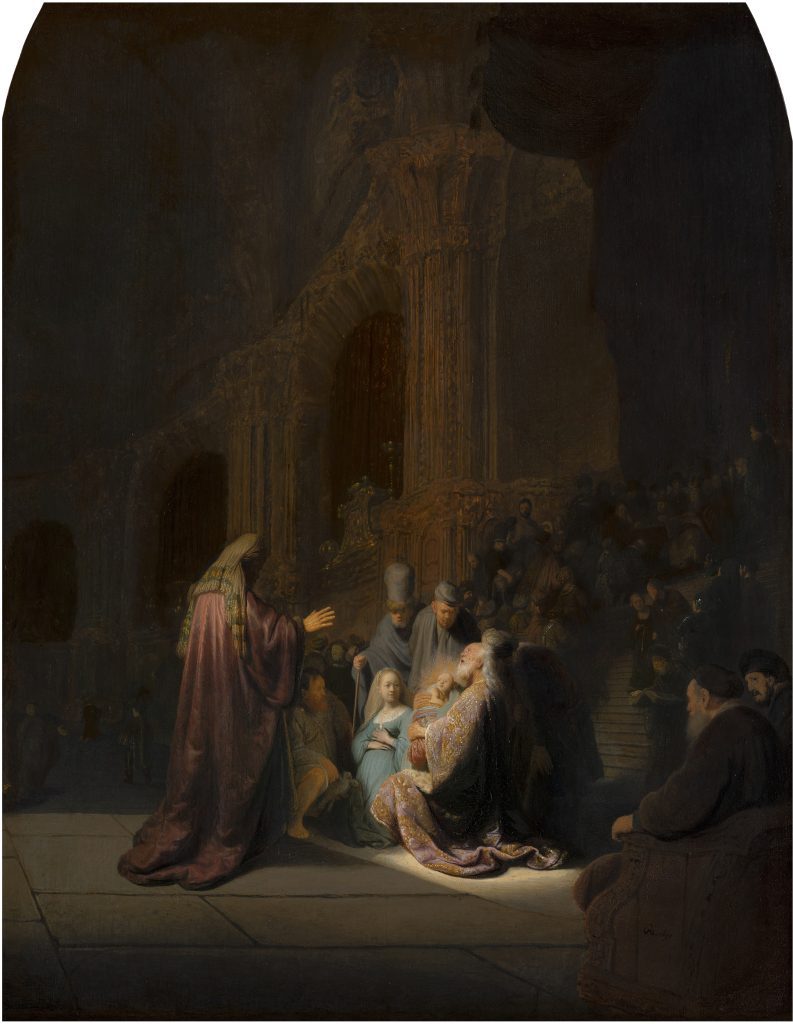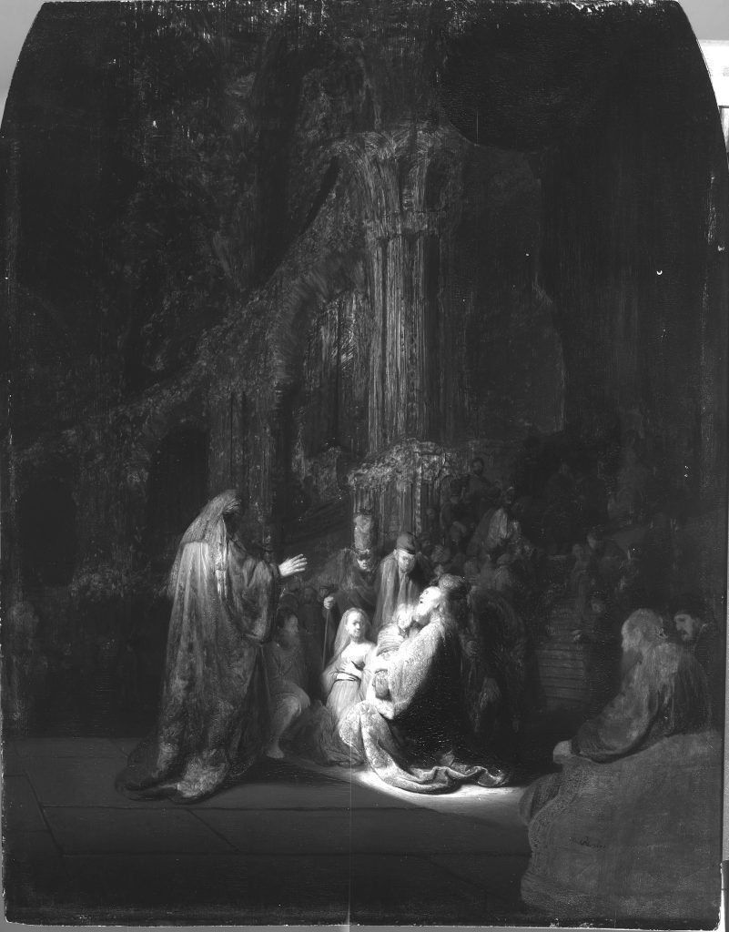 Simeon’s Song of Praise from 1631 (fig. 16) is a good example of where Rembrandt exploits both the ground and the brown sketch for the creation of dramatic light effects. The layers of ground—composed of a compact chalk layer followed by a light layer containing large aggregates of lead white with some chalk, earth particles, and fine carbon black—are so thin that the grain of the oak panel can be discerned on the paint surface. In a paint sample from the canopy in the upper right, the brown sketch layer is also visible (fig. 17).36 The darkness of the temple interior depicted in the background is largely suggested by allowing the light ground to show through the streaky layers of the brown sketch and the dark background paint, forming lively golden tonalities and highlights on the capitals and columns, an effect clearly revealed in the infrared image (fig. 18). In this way, Rembrandt exploits the reflective properties of the ground to suggest divine light shining from above, underscoring Simeon’s moment of revelation. Rembrandt continued this free technique for the creation of dramatic light effects in his later panel paintings.