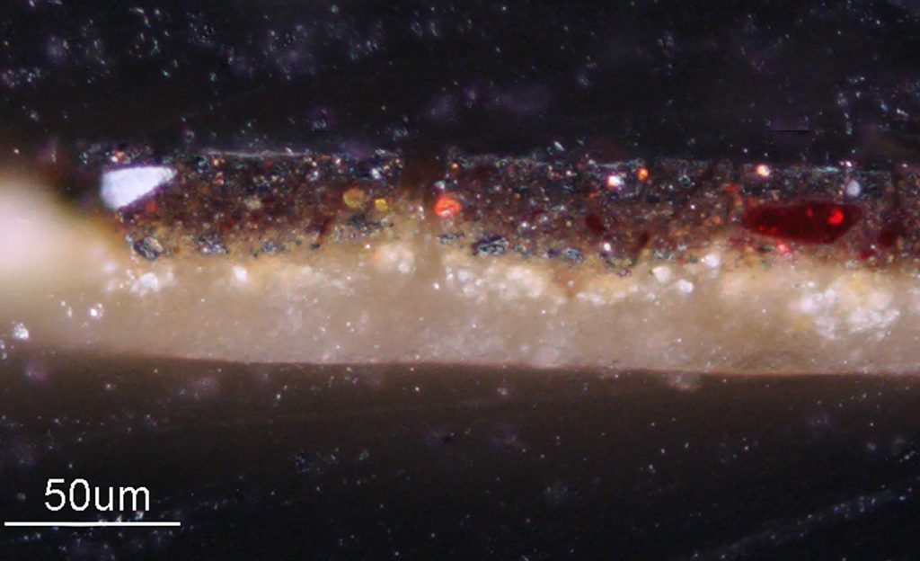 Essentially, Rembrandt’s ground layers can be organized into light and dark grounds, with commercially available light grounds used for his panel paintings and early paintings on canvas, and custom-made dark grounds for paintings on canvas from 1640 onward. Further subdivisions of the light grounds relate to the type of support: chalk-glue grounds with a lead-white rich layer for panels, lead-white rich oil grounds for copper supports, and gray-over-red grounds for the early canvas paintings from the 1630s. The dark-colored grounds used for canvas paintings from 1642 onward can be subdivided into quartz-clay grounds and several other types of other dark grounds.