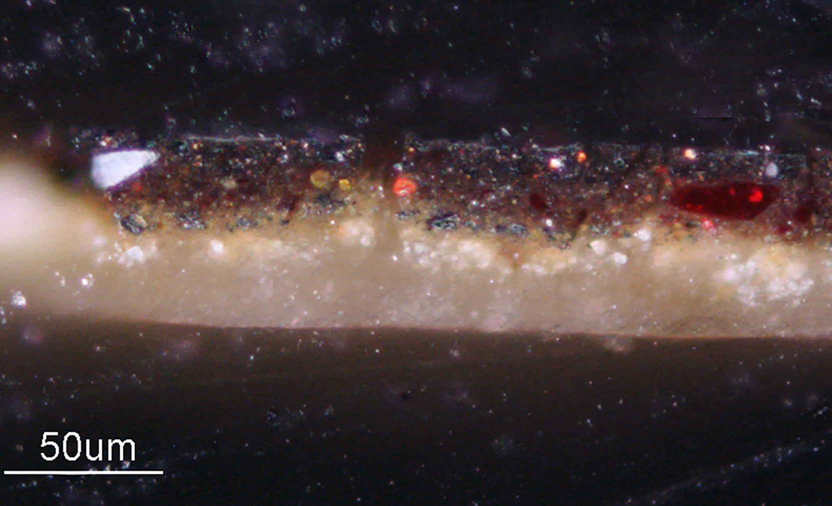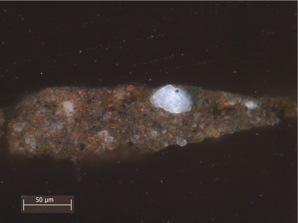 New research carried out by the Rijksmuseum as part of Operation Night Watch, using advanced imaging and highly specialized instrumentation, shows that the ground, which in some samples is extraordinarily thick (up to three hundred microns), is composed of quartz-rich micaceous (mica-containing) clay (figs. 31 and 32).60 Detecting clay minerals in paint cross sections using light microscopy, however, is extremely difficult due to the low refractive index of both the quartz and the clay minerals. SEM-EDX also has its limitations due to the extremely small size of the clay minerals. New imaging techniques, however, have made it possible to visualize areas of exposed ground in titanium-distribution XRF images due to the presence of titanium-rich minerals in the clay (see fig. 34). The muscovite (mica) in the clay can also be imaged with reflectance imaging spectroscopy (RIS).61 These advances in imaging technologies are extremely helpful, since quartz-clay grounds do not register strongly in x-radiographs.