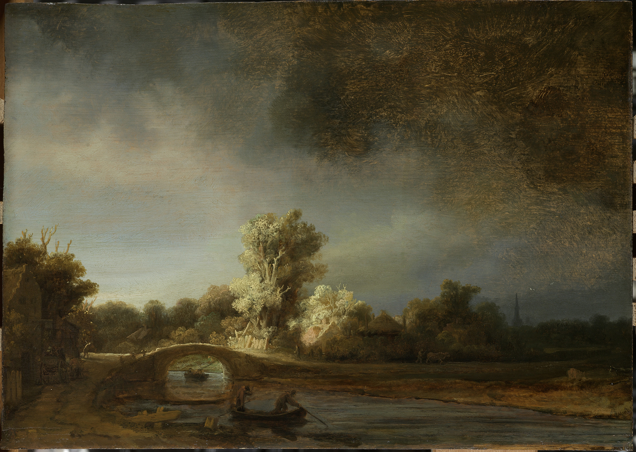 In Landscape with Stone Bridge from about 1639, the light ground is boldly exposed in the open brushwork of the dark sketch paint to suggest a stormy atmosphere (figs. 19 and 20).37 An even more impressive example is the unprecedented A Woman Bathing in a Stream from 1654 (National Gallery, London), where Rembrandt left large areas of the light brown ground exposed at the bottom of the woman’s raised shift, along the upper edge of her right arm, in the wrist and hand, and in between the vigorous brushstrokes, imbuing the intimate, informal study of Hendrickje Stoffels with a great sense of immediacy.38