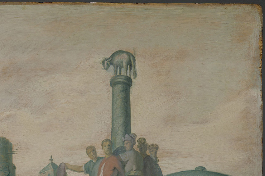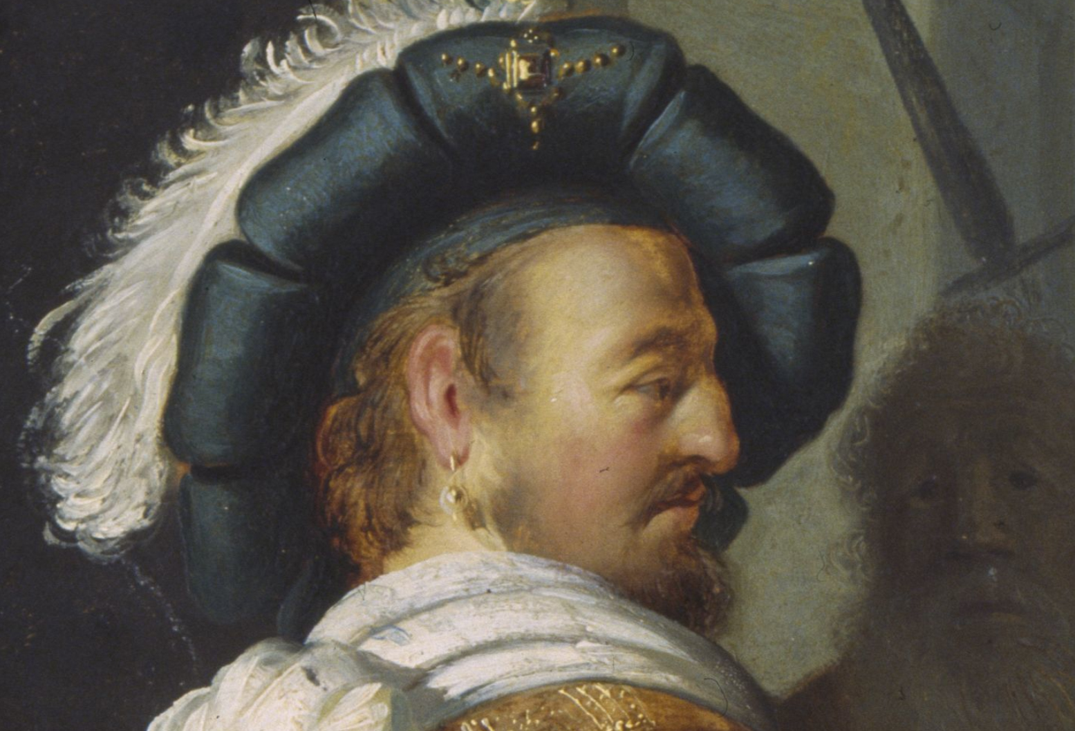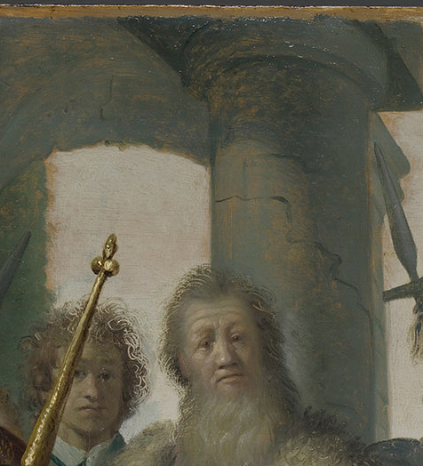 In his earliest small panel paintings, belonging to The Five Senses series from about 1624–1625, the ground appears to be of little or no consequence, given the dense application of paint. After completing his training with Pieter Lastman (1583–1633) in Amsterdam in 1625, Rembrandt embarked on a period of intense experimentation and started to use the light ground to create light effects. His first major history paintings, The Stoning of St. Stephen (1625; Musée des Beaux-Arts, Lyon) and History Painting of 1626 (fig. 5), both signed and dated, are remarkably direct and economical.26 The latter was researched and treated in the Rijksmuseum between 2015 and 2016, where analysis of paint samples showed that the light ground consists of a chalk-glue layer followed by a light brown layer containing lead white with a small amount of brown umber. The ground is evident over the entire surface of the panel, giving an overall light tonality to the open-air scene.27 Here Rembrandt experiments with using the ground to suggest spatial depth, albeit rather clumsily. The ground shows through numerous areas in the painting, including the sky, the upper part of the architecture, and the faces of the foreground figures (fig. 6). It is also visible in the broadly laid-in background at the right, surrounding the legs of the soldier wearing a sash and beret. In this painting Rembrandt also experiments with scribbling and scratching into the wet paint, using a variety of tools to create light effects in the hair and clothing of many of the figures (fig. 7). A striking area where the light brown ground was used for its tonal function is the shaded contour of the forehead and nose of the standing figure with the plumed beret at the far left (fig. 8).28