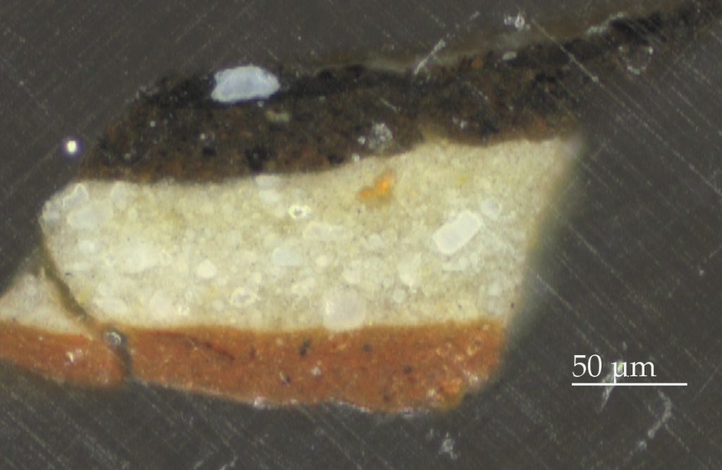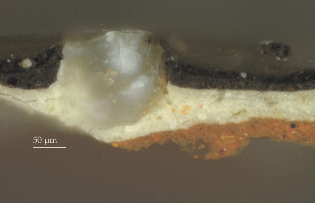Grounds on Rembrandt’s panels consist of two ground layers: a chalk-glue layer that was applied to fill the coarse grain of the wood, followed by a light, oil-based layer, invariably very thin (between five and ten microns), containing lead white and a little earth pigment. The upper ground layer, often referred to as the “priming” in English, made the panel less absorbent and provided a smooth surface and warm light tone on which to paint. This type of two-layered ground was commonly used for panels in the seventeenth century and earlier and has been identified by Groen in all of Rembrandt’s panel paintings.12 In general, both layers are usually thin enough to permit the wood grain of the panel to be perceived on the surface of the painting. It should be stressed that the complete layer structure of the ground can often only be seen by studying a cross section of a paint sample; the layers are sometimes barely perceptible, even with magnification, due to their thinness and/ or increased transparency (loss of opacity) from saponification of lead white particles in the upper ground.13