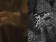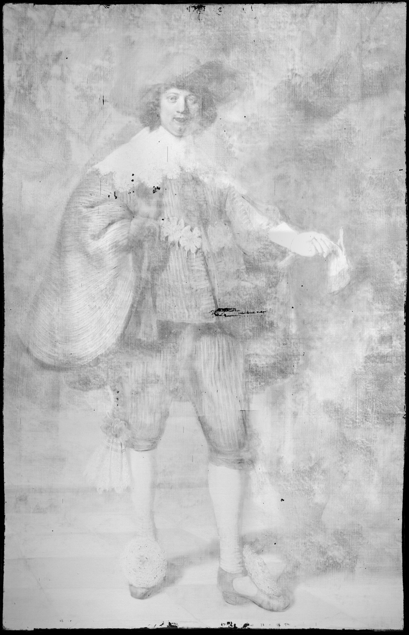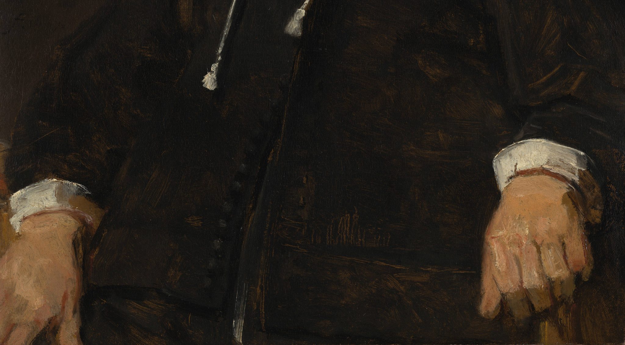 In the portraits of Soolmans and Coppit from just a year or two later, which are equally large and fully worked up, the light ground and brown sketch seem to play a more significant role in ensuring tonal unity and creating a broader range of tones. The light gray ground, which can be visualized in the x-radiographs and lead-distribution XRF images due to the presence of lead white, were left in reserve for the light areas in the paintings, including the faces (figs. 26 and 27).44 For the lit areas of the faces, opaque paints were applied directly on top of the light ground. Examination with the stereomicroscope, coupled with IRR, XRF imaging, and especially RIS-SWIR in the short-wave infrared spectral region (900 to 2500 nanometers), shows that Rembrandt laid in the compositions using a broadly applied painted sketch in various tones of brown.45 Visible on the paint surfaces, where the final brushwork is thinner or more open, the sketch layers show through in many areas of the paintings: in the dark backgrounds, the hair, the faces, the clothing, the cast shadows on the floor, and the dark gray curtains.46 In Soolmans’s face, which is more strongly lit than that of Coppit, the warm brown sketch has been left visible for the shadow along the contour of his face (fig. 28). For their black clothing, which is essentially painted in a single layer of ivory black on top of the brown sketch, both the ground and the sketch show through the loosely painted half-shadows in the folds, decorative braiding, and contours of the figures, creating subtle tonal transitions that play an essential role in the modeling and convincing positioning of the figures in space (figs. 29 and 30).