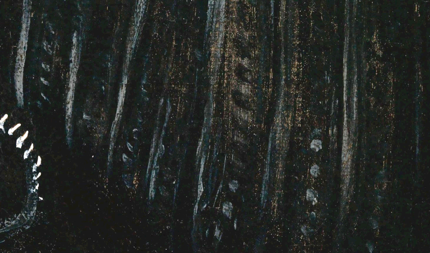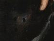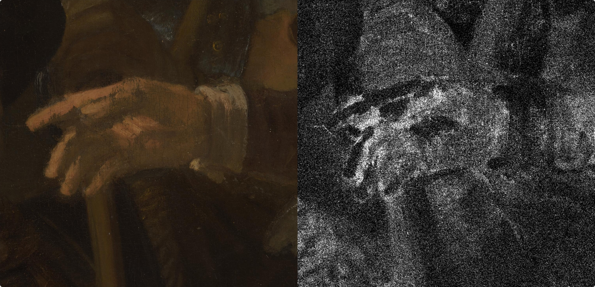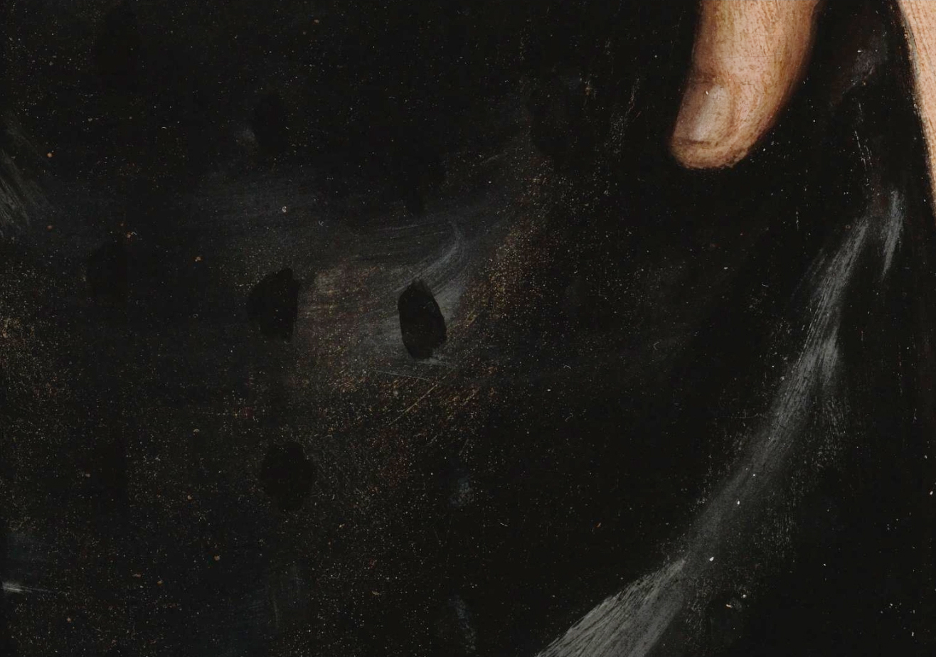 The use of a dark ground in The Night Watch marks an important stylistic development in Rembrandt’s use of colored grounds. Instead of the combination of light ground and dark painted sketch he used for his earlier canvas paintings, Rembrandt chose a brown ground in combination with a painted sketch in a light-colored chalk-rich paint. The compositional sketch, which could be visualized for the first time in the calcium-distribution XRF image associated with the chalk (calcium carbonate)—particularly in the upper part of the picture, where the sketch layer is only covered with a single layer of the earth-rich background paint—represents an important new discovery regarding Rembrandt’s painting practice (fig. 33).62 Parts of the sketch are also exposed in the dog at the lower right due to abrasion of the thin surface paint. Rembrandt sketched additional forms in dark brown paint, some of which can be seen with the naked eye, such as the earlier position of the feet of the musketeer to the right of Wilhem van Ruytenburch, one of the central figures. Apart from the illuminated figures in the foreground, the final paint layers were applied with great economy, in just one or two paint layers, leaving areas of the brown ground deliberately exposed as part of the modeling, such as we see in Sergeant Rombout Kemp’s outstretched hand, where the brown ground was left unpainted for the shadow areas of his open hand (fig. 34).63