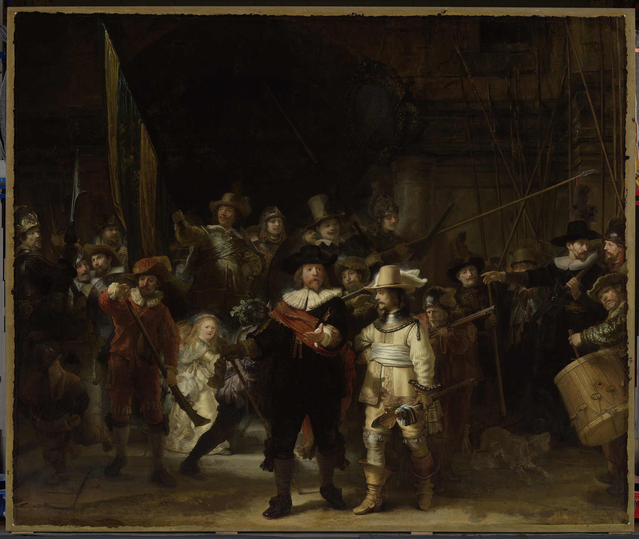 Unlike Rembrandt’s earlier canvas paintings, which have conventional light grounds with an elaborate painted sketch in various tones of brown, the brown ground in The Night Watch simplified the painting process, providing a readymade midtone on top of which darker and lighter tones could be added—not dissimilar to the unfinished Portrait of a Boy in a Fancy Costume (ca. 1655; Norton Simon Museum, Pasadena), which also has a brown ground. As Ernst van de Wetering explains, working on a colored ground had an immediate advantage since, in this way, a convincing rendering of forms could more easily be achieved.64