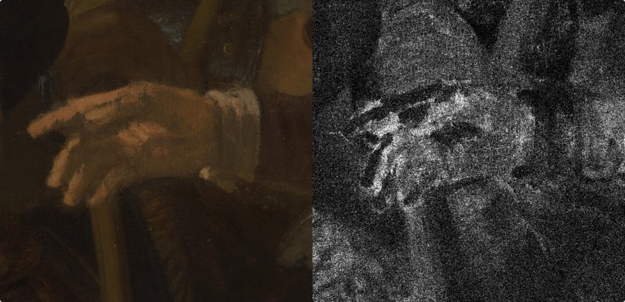 The use of a dark ground in The Night Watch marks an important stylistic development in Rembrandt’s use of colored grounds. Instead of the combination of light ground and dark painted sketch he used for his earlier canvas paintings, Rembrandt chose a brown ground in combination with a painted sketch in a light-colored chalk-rich paint. The compositional sketch, which could be visualized for the first time in the calcium-distribution XRF image associated with the chalk (calcium carbonate)—particularly in the upper part of the picture, where the sketch layer is only covered with a single layer of the earth-rich background paint—represents an important new discovery regarding Rembrandt’s painting practice (fig. 33).63 Parts of the sketch are also exposed in the dog at the lower right due to abrasion of the thin surface paint. Rembrandt sketched additional forms in dark brown paint, some of which can be seen with the naked eye, such as the earlier position of the feet of the musketeer to the right of Wilhem van Ruytenburch, one of the central figures. Apart from the illuminated figures in the foreground, the final paint layers were applied with great economy, in just one or two paint layers, leaving areas of the brown ground deliberately exposed as part of the modeling, such as we see in Sergeant Rombout Kemp’s outstretched hand, where the brown ground was left unpainted for the shadow areas of his open hand (fig. 34).64