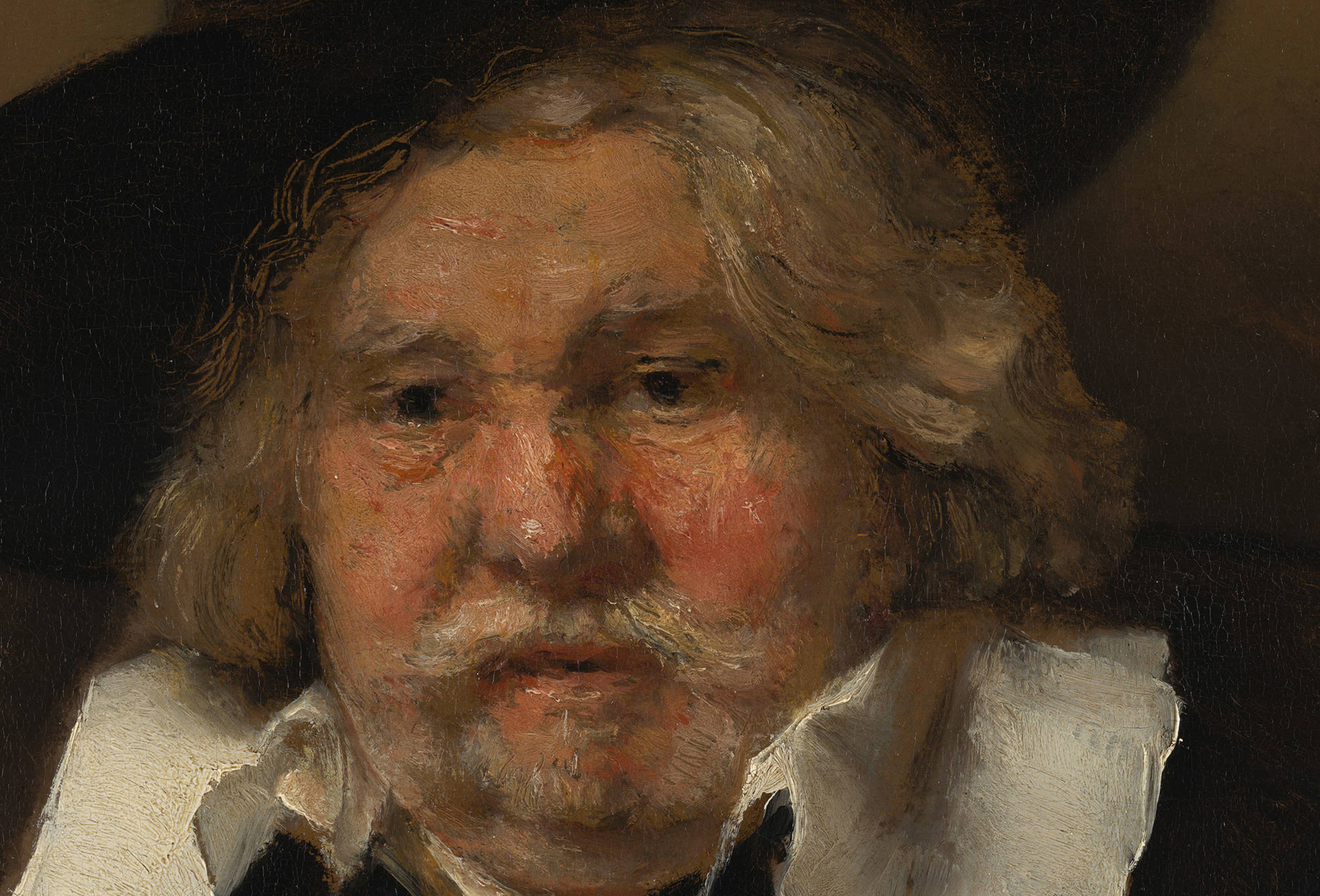 There are also dark grounds composed primarily of brown earth pigments, which include Portrait of an Elderly Man (fig. 3), mentioned in the introduction, whose ground consists of a warm brown layer containing brown and red ocher, chalk, lead white and a little charcoal black over a red-brown lower layer. The bold technique of this informal late portrait, evidently painted from life, is immediately striking. The warm brown ground, which acts as a base tone unifying the composition, exerts a strong influence on the painting’s overall tonality, as large areas of the ground were deliberately left unpainted to function as zones of shadow and half-shadow in the hair and in shaded areas of the sitter’s face, white collar, cuffs, and his left hand. The ground also shows through the broadly applied brushstrokes and scratch marks in the hair and black doublet, enhancing the extraordinary naturalism of the man’s slumped pose (figs. 35 and 36). The warm flesh tones, modeled wet-in-wet with high impasto, in considerable detail compared to the rest of the figure, stand in marked contrast to the areas of exposed ground and contribute to the exceptionally convincing three-dimensionality of the portrait.79 This painting is another good example of how Rembrandt achieved the much-desired effects of welstand and houding by relying on the interplay between the ground and subsequently applied paint layers. Here Rembrandt also exploits the fact that the ground visually recedes, as it does in Woman Bathing in a Stream. The economy of finish in both these works is intriguing.80 Whether it relates to the sitters having been painted from life; the informal, intimate character of the paintings, giving the impression of capturing a fleeting moment in time; or a conceit for the appreciation of art connoisseurs remains unclear. Despite the appearance of being unfinished, both paintings are signed and dated.