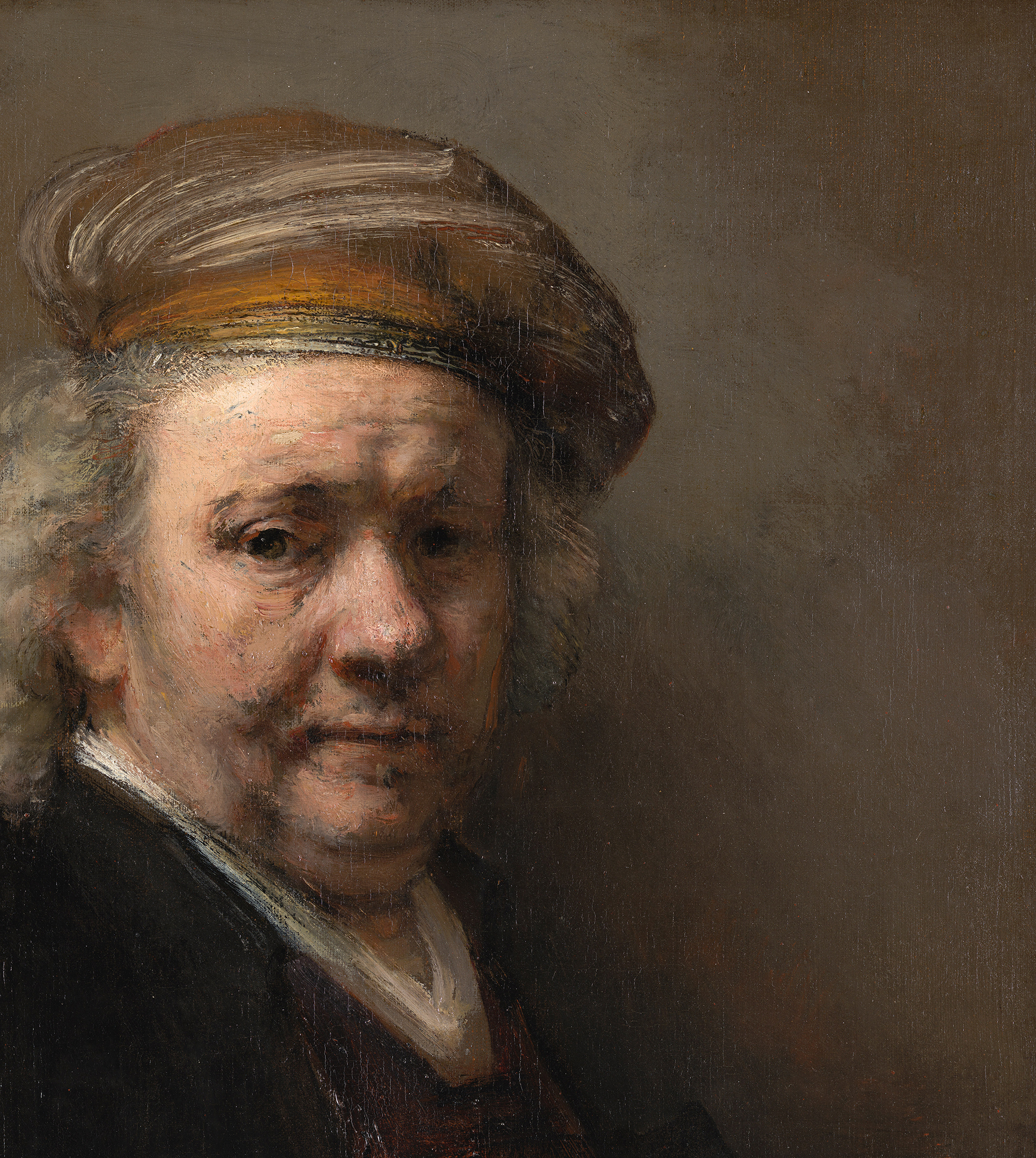 In addition to brown quartz-clay grounds, other types of dark grounds were identified by Groen in Rembrandt’s late canvas paintings, suggesting a certain degree of practicality regarding the precise compositions of ground layers.73 A cluster of grounds containing lead white and umber, applied in one or two layers, were identified in paintings from the 1650s and 1660s. Examples include Saul and David (1651–1654/ 1655–1658; Mauritshuis), which has a gray-brown ground consisting of two layers that are essentially completely covered by the subsequent paint layers.74 Rembrandt’s Self-Portrait from 1669 (see fig. 37), also in the Mauritshuis, has a similar ground applied as a single layer. Individual pigment particles of organic brown, bone black, yellow earth, organic lake, smalt, quartz, and a single vermilion particle identified in the upper ground layer of Saul and David suggest a mixture of paint residues from the palette or rinsing pot.75 Complex mixtures of pigments have also been identified in the ground of Rembrandt’s Self-Portrait at the Easel (1660; Musée du Louvre, Paris), suggesting that these grounds, like the quartz-clay grounds, were made and applied in Rembrandt’s studio.76