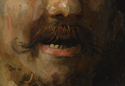 Rembrandt’s The Laughing Man from 1629–1630 (fig. 9), part of a series of three tronies painted on gilded copper, is a good example. Here Rembrandt’s interest in the underlying gold layer is related to the creation of luminous light effects, similar to his use of light grounds on panel supports. Although gilded copper seems a unique choice, he may have been inspired by the luminosity of works on copper by Adam Elsheimer (1578–1610), whose Stoning of Saint Stephen (ca. 1603–1604; National Galleries of Scotland, Edinburgh), is painted on copper with a silver-colored metallic coating. Rembrandt must have known or heard about this work, given the compositional similarities with his own 1625 The Stoning of Saint Stephen.30 The support of The Laughing Man was prepared with a ground containing lead white with a little earth pigment and bone black, on top of which the thin layer of gold leaf was applied.31 The gold layer shines through the thinly applied shadows in the face, in the scumbles where the left shoulder and neck meet the background, and at the bottom of the gorget, where the underlying gold creates a shimmering mimetic effect. It was also used to create lustrous highlights in the moustache and beard where Rembrandt scratched into the wet paint with a blunt tool, exposing the gold, and along the right side of his neck, where it was left exposed to create a subtle contour (figs. 10 and 11). The subdued colors of the tronie are also striking: its gray background, brown gorget, and pink-yellow, thickly impastoed flesh tones with blue-gray half-shadows, together with the golden highlights, create a refined harmony.